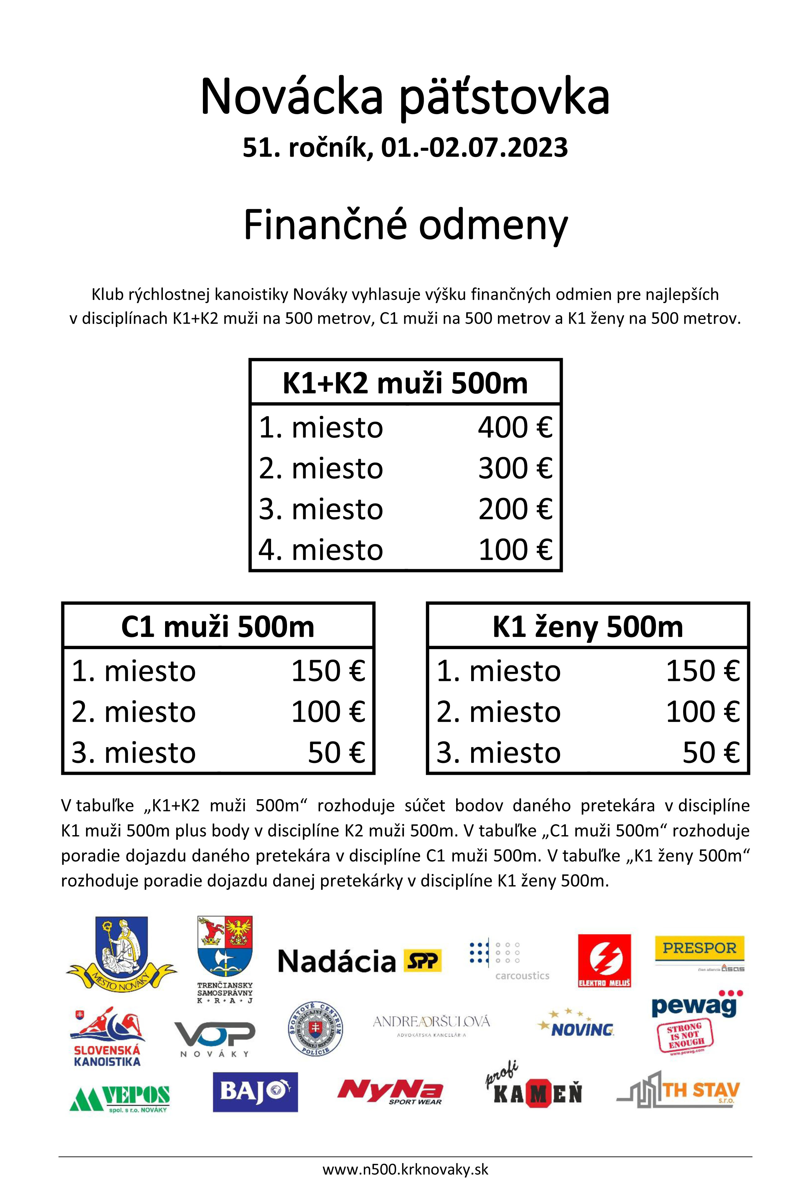 Klub rýchlostnej kanoistiky Nováky, vďaka sponzorom a partnerom Nováckej päťstovky, zverejňuje výšku finančných odmien pre dospelých: