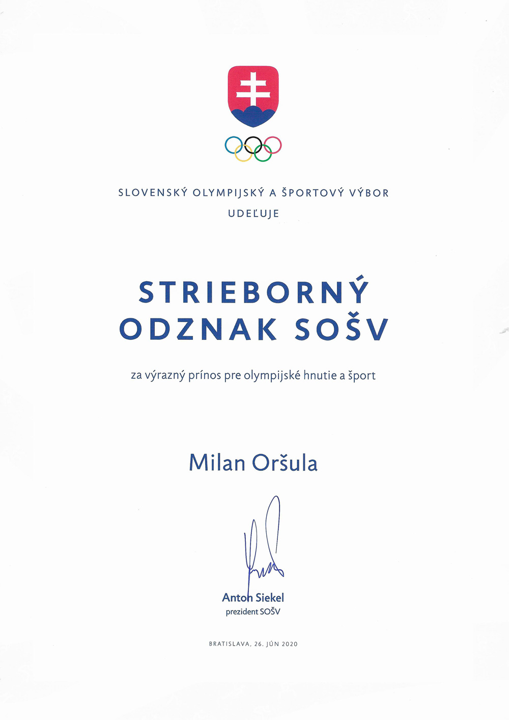 Milan Oršula bol dňa 26.06.2020 vyznamenaný za dlhoročný a výrazný prínos pre olympijské hnutie a šport.