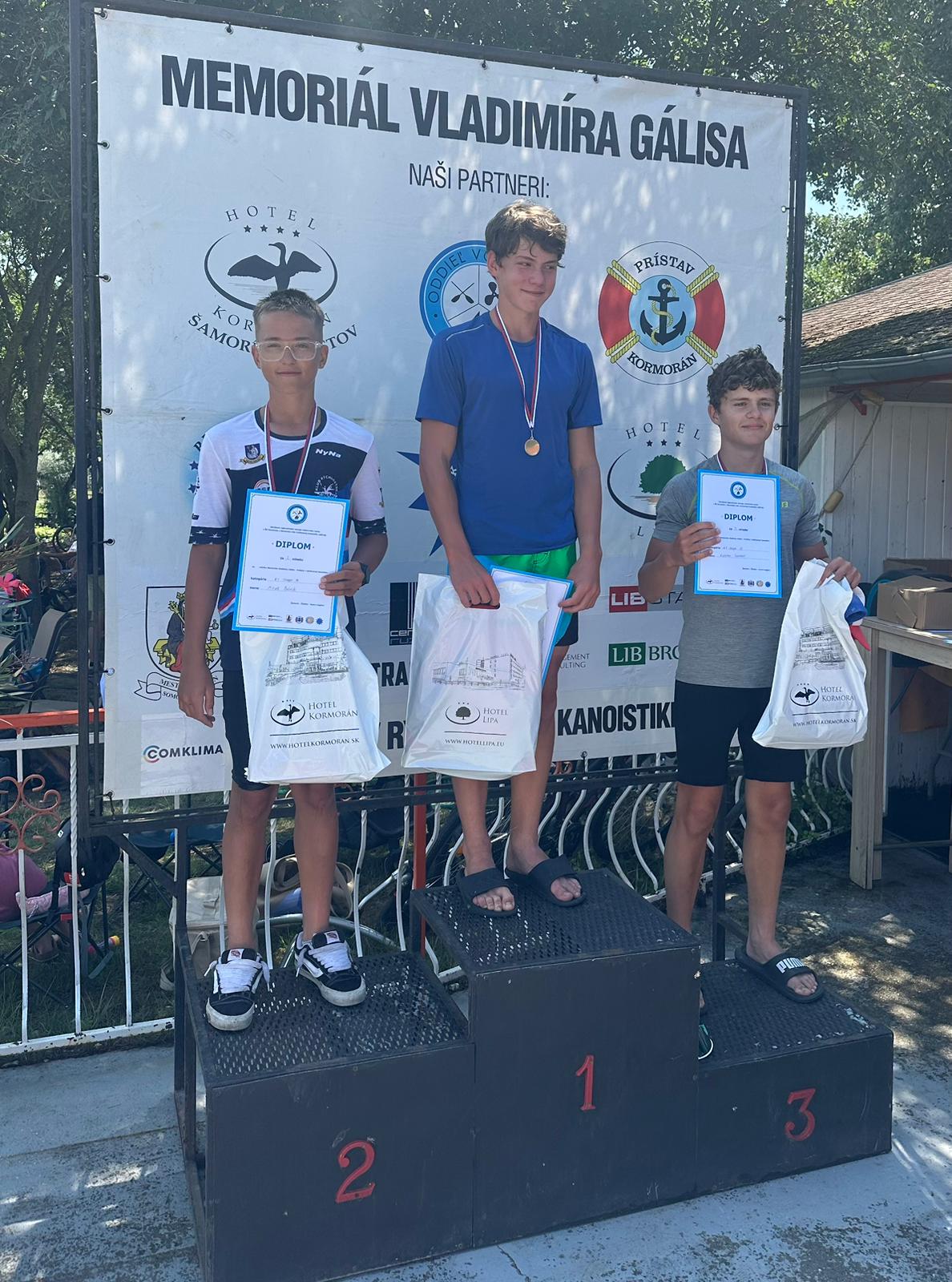 Sobota Cristian (vľavo - 2. miesto) a Kocúr Tomáš (v strede - 1. miesto), K1 Kadeti, 200m